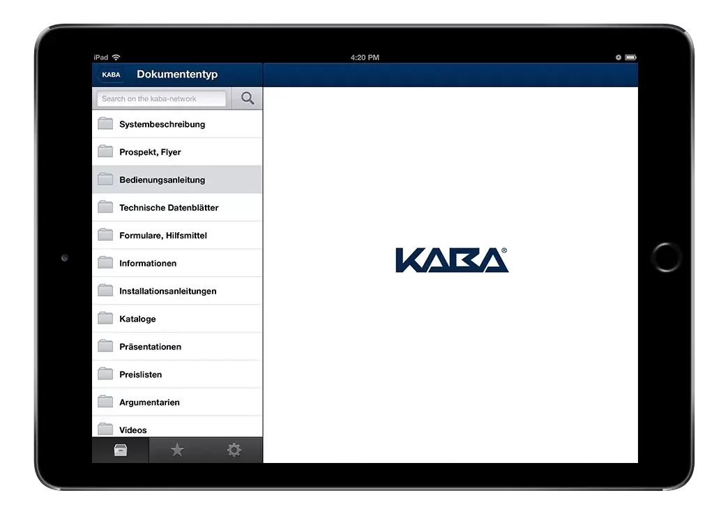 Die Applikation Kaba Docs dient der Effizienzsteigerung und Prozessoptimierung im Bereich Sales und Marketing. Mit der Applikation sollen relevante Informationen wie Kataloge, Preislisten oder Installationsvideos für Mitarbeiter der Kaba AG auf mobilen Endgeräten verfügbar gemacht werden.
