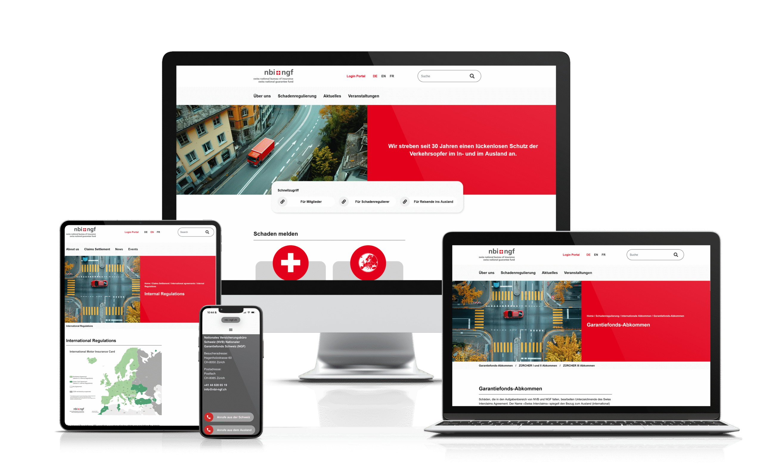 Das Nationale Versicherungsbüro Schweiz (NVB) und der Nationale Garantiefonds (NGF) koordinieren gesetzliche Aufgaben rund um die Schadenregulierung bei Verkehrsunfällen sowie grenzüberschreitende Versicherungsangelegenheiten. Ziel des Projekts war die Konzeption und Umsetzung einer modernen, klar strukturierten Website mit verständlicher Informationsarchitektur und zeitgemässer technischer Grundlage.